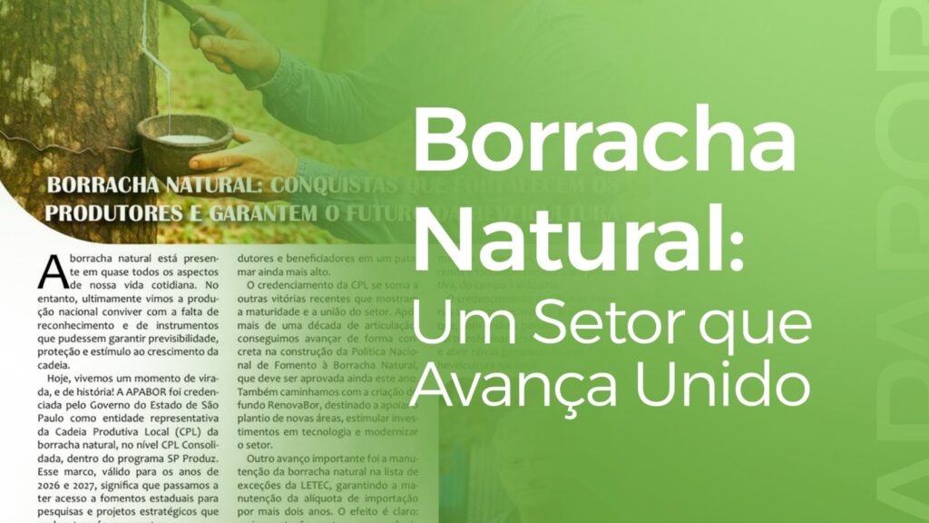 A heveicultura brasileira vive um momento histórico!O credenciamento da Cadeia Produtiva Local (CPL) da borracha natural pelo Governo de São Paulo marca um novo patamar de reconhecimento e fortalecimento do setor. Uma grande vitória da APABOR! Essa conquista, somada ao Plano Nacional da Borracha, à criação do RenovaBor e à manutenção da borracha natural na […]