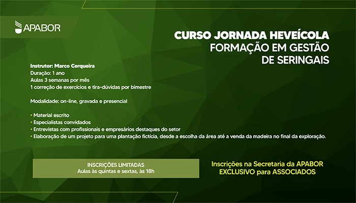 A APABOR está com inscrições abertas para o Curso Jornada Heveícola – Formação em Gestão de Seringais, com o instrutor Marco Cerqueira. O curso tem duração de 1 ano, com aulas três vezes por semana – às quintas e sextas, às 16h – e uma correção de exercícios e tira-dúvidas por bimestre. A modalidade de […]