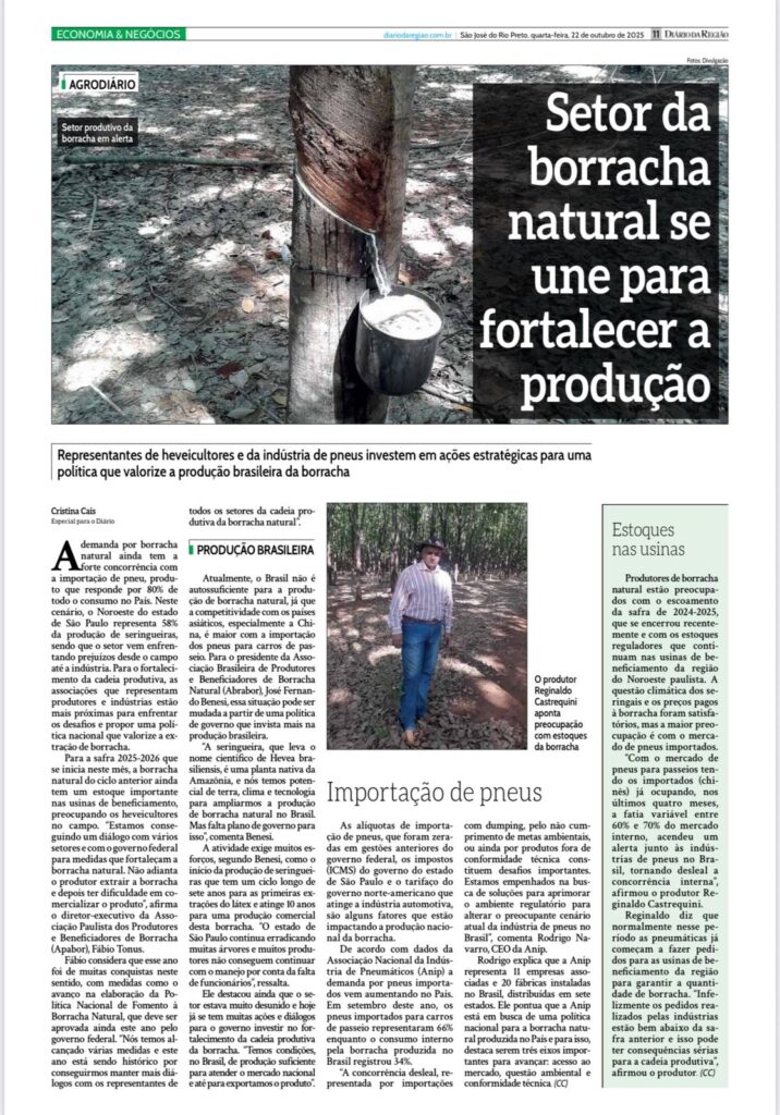 A edição desta quarta-feira (22/10) do Jornal Diário da Região, de São José do Rio Preto, traz uma reportagem sobre o movimento do setor produtivo da borracha natural para fortalecer a cadeia e ampliar a competitividade da produção brasileira.